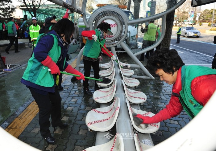 [시민일보]송파구는 지난 3일 오전 종합운동장역에서 '주민과 함께하는 새봄맞이 대청소' 행사를 열었다. 이번 행사에는 지역주민과 공무원 등 300여명이 함께해 시설물들을 청소했다. 사진은 의자를 닦고 있는 행사 참가자들의 모습.