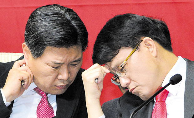 4일 오전 서울 여의도 국회 245호 회의실에서 열린 원내대책회의에서 홍문종 사무총장과 윤상현 원내수석부대표가 귀앳말을 나누고 있다.