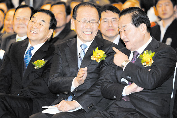 5일 오후 서울 세종문화회관 세종홀에서 이인제 새누리당 의원의 '통일은 경제다' 출판기념회가 열린 가운데 참석한 이재오의원과 황우여 당대표, 서청원 새누리당 의원(왼쪽부터)이 이야기를 나누고 있다.