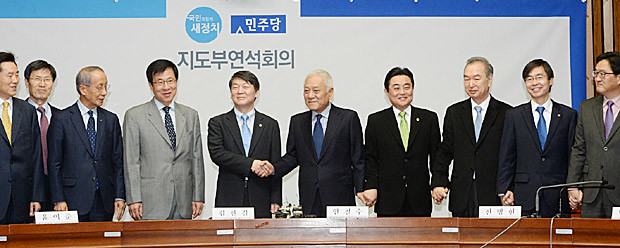 5일 오전 민주당-새정치연합 지도부연석회의가 열린 서울 여의도 국회 245호실에서 참석자들이 기념촬영을 하고 있다. 새정치 김효석, 윤영관, 윤여준, 민주당 신경민, 안철수 새정치연합 중앙운영위원장, 김한길 민주당 대표, 전병헌 원내대표, 새정치 박호군, 조경태, 우원식.