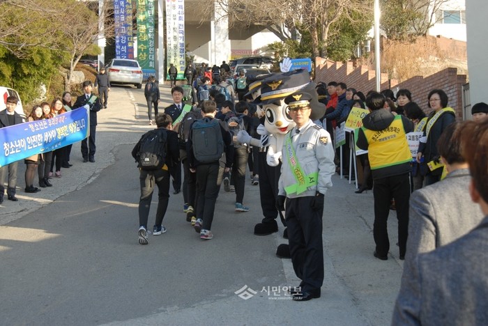 [시민일보]지난 6일 여수교육지원청이 지역내 초·중·고등학생 및 일반 시민들을 대상으로 학교 폭력예방 및 근절을 위해 합동 등교길 캠페인과 홍보활동을 실시했다. 사진은 통학로에서 학교폭력 근절활동을 펼치고있는 시민들과 관계자들의 모습.