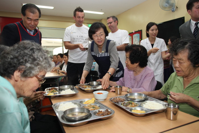 | ▲ 신연희 구청장이 수서종합사회복지관에서 열린 위문행사에서 일일 자원봉사자로 나서 관계자들과 함께 지역 노인들에게 따뜻한 식사제공하고 있다. | ||