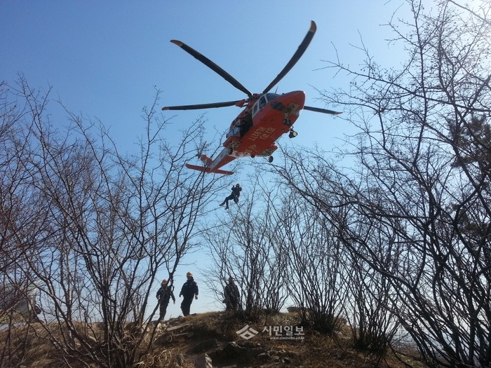 [시민일보]10일 오전 인천소방안전본부 119특수구조단이 긴급기동대, 소방항공대와 함께 봄철 등산객 증가로 인한 사고를 대비해 중구 영종도에 위치한 백운산일대에서 산악사고 인명구조 훈련을 실시했다. 사진은 이날 훈련에 참여한 소방본부관계자들이 소방헬기를 이용한 훈련을 하는 모습.