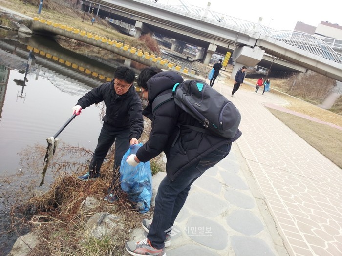 [시민일보]경기 용인시 수지구 건설도시과는 지난 8일 자원봉사자와 함께하는 하천 정화 행사를 개최하고 탄천, 성복천변에 겨우내 방치된 묵은 쓰레기, 생활폐기물 및 불법광고물 등을 일제 수거했다. 사진은 자원봉사자들이 하천 쓰레기를 수거하고 있는 모습.