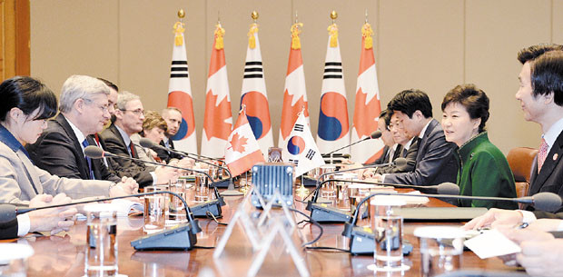 박근혜 대통령이 11일 오후 청와대에서 스티븐 하퍼 캐나다 총리와 확대정상회담을 하고 있다. 이번 정상회담의 주요 의제는 자유무역협정(FTA)과 교역·투자, 에너지·자원, 과학·기술, 북극, 산림 등 제반분야에서의 실질적인 협력 강화 방안과 동북아 지역정세 등이 될 것이라고 청와대는 전했다.