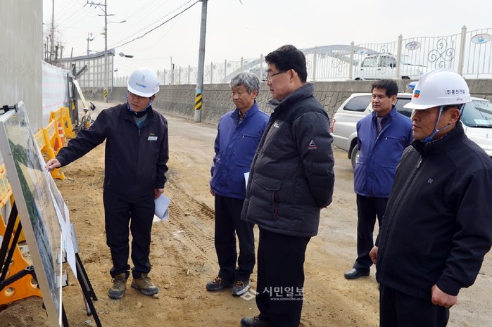 경기 동두천시는 지난 11일 해빙기를 맞아 시민 안전사고 예방을 위해 재난취약지구 현지점검을 실시했다. 이날은 빗물펌프장 용량증설 공사현장 등 대형공사장 주민안전과 밀접한 지역 및 시설점검을 실시했다. 사진은 안점점검 활동에 참여한 김성재 부시장(가운데)과 관계자들의 모습.