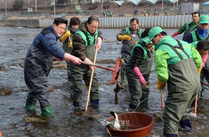 지난 11일 서울 동대문구가 해빙기를 맞아 '새마을운동 봄맞이 국토대청결운동'을 열고 지역 곳곳의 쓰레기를 수거하고 불법광고물 등을 제거하는 환경정화활동을 실시했다. 사진은 이날 중랑천 정화활동에 참여한 유덕열 구청장과 새마을운동 회원들의 모습.