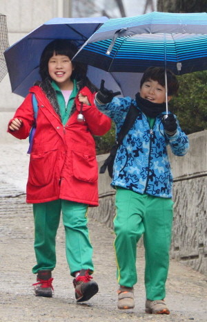 봄비가 내린 12일 오후 서울 서대문구 미동초등학교에서 학생들이 우산을 쓰고 걸음을 재촉하고 있다.