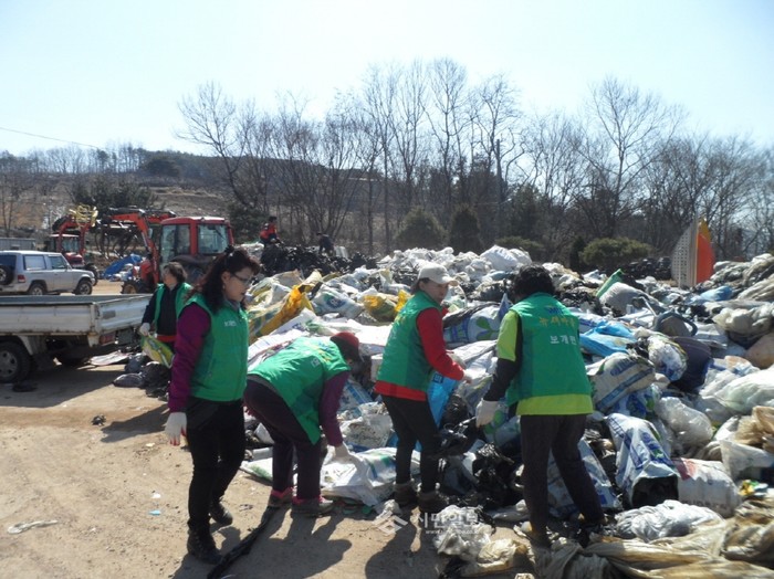 경기 안성시 보개면 새마을남녀지도자회는 봄을 맞아 마을 환경을 정비하고 자원 재활용을 촉진하기 위해 새마을남녀지도자회 회원 및 주민 60여명과 함께 폐비닐 80여톤, 헌옷 2톤가량을 수거했다. 사진은 이날 수거한 물품을 분리중인 주민들의 모습.