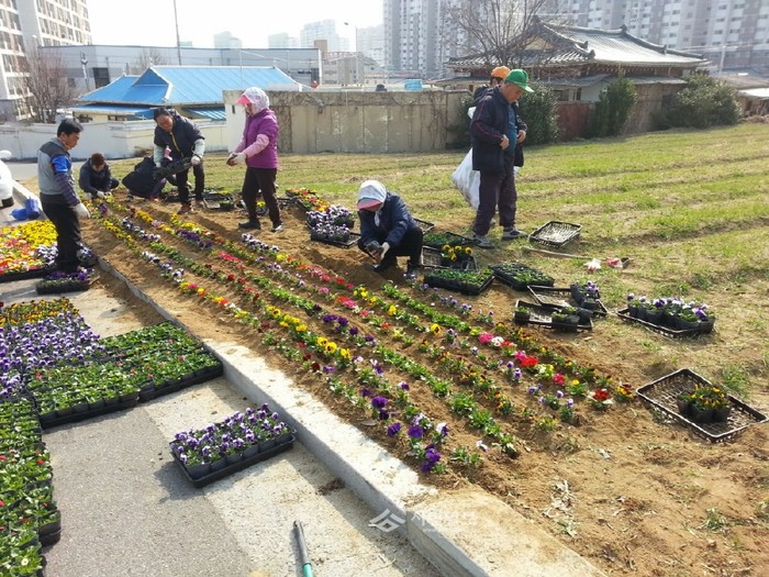 지난 11일 경남 구미시 상모사곡동 주민센터는 지역공동체일자리사업, 공공근로 참여자들과 함께 박정희 전 대통령 생가 앞 새마을꽃밭에 팬지 3500여본을 심고 화분을 단장했다. 사진은 이날 활동에 참여한 주민들의 모습.