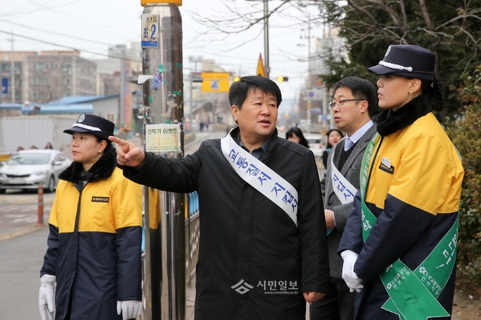 13일 오전 인천 계양구 서운초등학교 주변 어린이보호구역내에서 구청장과 구 관계자들, 계양경찰서를 비롯, 70여명이 참여해 '교통사고 줄이기 교통안전 캠페인'을 실시했다. 사진은 학생들의 통학로에서 안전캠페인을 진행하고 있는 박형우 구청장과 관계자들의 모습.