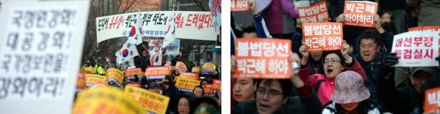 (좌)15일 오후 서울 종로구 동아면세점 앞에서 대한민국재향경우회 등 관계자들이 참석한 '반국가 종북세력 대척결 22차 국민대회'가 열리고 있다. 같은 시각 청계광장에서는 국정원시국회의 등이 '3.15부정선거 54년, 국가기관 대선개입사건 특검촉구 민주수호 국민대회'를 진행했다. (우)15일 오후 서울 종로구 서린동 청계광장에서 국정원시국회의 주최하는 제36차 시국촛불 집회, '3.15부정선거 54년, 국가기관 대선개입사건 특검촉구 민주수호 국민대회'가 열리고 있다.