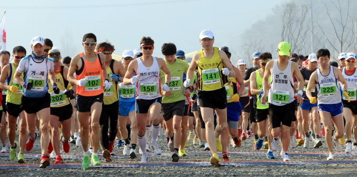 2014 섬진강 꽃길 마라톤대회가 16일 오전 전남 광양시 다압면 섬진강 둔치에서 열린 가운데 아마추어 동호인들이 싱그러운 봄기운을 만끽하며 섬진강변을 따라 힘차게 달리고 있다. /사진=전남도 제공