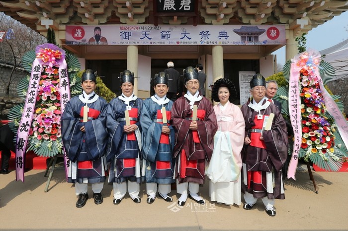서울 종로구의회는 지난 15일 단기 4347년을 맞아 사직공원내 단군성전에서 개최된 단군숭모 기념일 중 하나인 어천절의 대제 봉행에 참석했다. 사진은 이날 어천절에 참석한(오른쪽 세 번째부터) 오금남 의원, 김영종 종로구청장, 어숙연 의원.