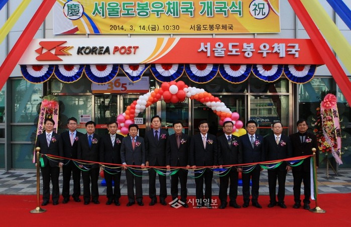 서울지방우정청(청장 김기덕)이 지난 14일 오전 새롭게 문을 연 서울도봉우체국(서울 도봉구 노해로 150)에서 유인태 국회의원, 이동진 도봉구청장 등이 참석한 가운데 개국행사를 열었다. 주요참석인사들이 테이프를 자르고 있다.(사진 왼쪽 다섯 번째부터 유인태 국회의원, 김기덕 서울지방우정청장, 박주석 서울도봉우체국장, 이동진 도봉구청장)
