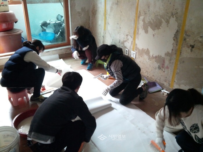 서울 고양시 덕양구의 공무원들로 구성된 '사랑의 가정도우미'는 지난 15일 고양동 기초생활수급자의 집을 방문해 도배작업과 전등·스위치 등을 교체했다. 사진은 이날 행사에 참여해 도배작업중인 사랑의 가정도우미.