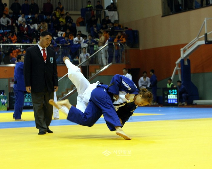 서울 성동구청 유도부의 이나라 선수가 지난 14일까지 열린 '2014 여명컵 전국유도대회(국가대표 2차 선발전) -70kg급에 출전해 은메달을 획득하고 국가대표 상비군으로 선발됐다. 사진은 이나라 선수가 1차전에서 3초만에 한판승으로 승리하는 모습.