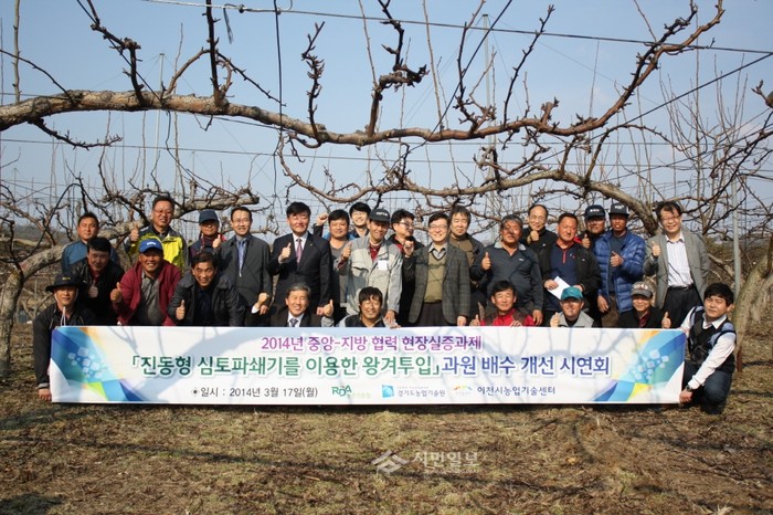 경기 이천시 농업기술센터에서 지난 17일 국립원예특작과학원, 경기도농업기술원과 협약을 체결하고 시연회를 열었다. 이 협약은 '진동형 심토파쇄기 이용 왕겨 투입에 의한 과수원 배수개선 연구과제 수행'을 위한 것이다. 사진은 시연회 이후 관계자들이 기념촬영을 하고 있는 모습.