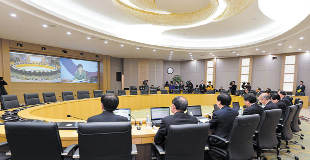 18일 오전 청와대와 정부세종청사 간 영상회의로 진행된 국무회의에서 정홍원 국무총리와 국무위원들이 세종시 정부세종청사 국무회의장에서 박근혜 대통령의 모두발언을 경청하고 있다.