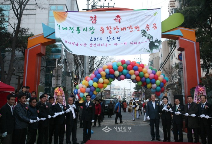 지난 18일 서울 강동구가 시장 홍보에 큰 역할을 할 것으로 기대되는 높이 7.4m의 시장상징 조형물 겸 종합 안내간판을 설치하고 준공식을 열었다. 사진은 이날 준공식에 참여한 구청 및 시장 상인회 관계자들이 제막식을 하는 모습.