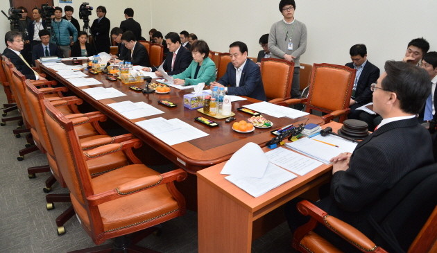 19일 오후 서울 여의도 국회에서 열린 미래창조과학방송통신위원회 법안심사소위원회에서 조해진 소위원장 등 새누리당 의원들이 논의를 하고 있다. 이날 미방위는 새누리당 단독으로 열려 원자력시설 등의 방호 및 방사능 방재 대책법(원자력방호방재법) 개정안을 단독 상정했지만 민주당 등 야당이 불참해 의결을 하지 못한 채 정회됐다.