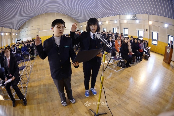 지난 19일 인천북부교육지원청은 북부영재원이 위치한 진산초 대강당에서 학생·학부모·학교장·지도교사 등 250여명이 참석한 가운데 북부영재원 입학식 및 개강식을 실시했다. 사진은 학생들이 이날 입학식에서 '신입생 선서'를 하고 있는 모습.