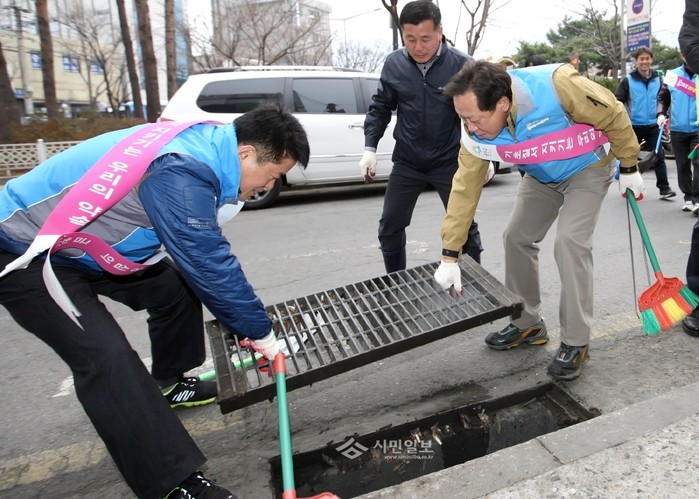 20일 오전 서울 금천구 전역에서 클린마을봉사단·주민·공무원 등 800여명이 '새봄맞이 대청소'를 실시해 보도 및 시설물 물청소, 불법투기 쓰레기수거, 빗물받이내 오물수거, 무단투기 근절 캠페인 등을 진행했다. 사진은 캠페인에 참여한 지역주민들이 빗물받이내 오물을 수거하는 모습.