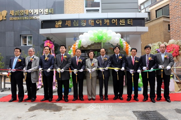 20일 오전 서울 강남구 지역사회 노인들의 노후생활 안정과 심신기능의 유지 및 향상을 도모하기 위해 설립된 논현동에 위치한 노인복지센터가 '세심정데이케어센터'로 리모델링을 마치고 개관했다. 사진은 이날 개관식에 참석한 신연희 구청장(왼쪽에서 여섯 번째)과 관계자들이 테이프 커팅식을 진행하고 있는 모습.