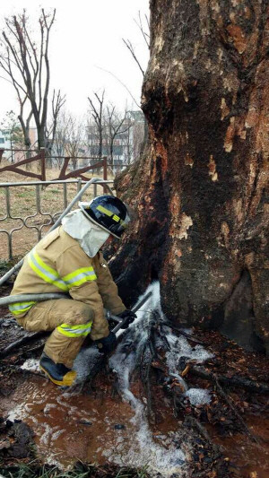 20일 오전 8시께 경기 안산시 상록구 광덕4로 인근에 있는 400년 된 느티나무(보호수-경기 안산 05)에 불이 나 17분 만에 꺼졌다. 이 느티나무는 높이 21m, 둘레 4.3m 규모로, 1982년 10월 안산시 보호수로 지정됐다. /사진=경기소방재난본부 제공