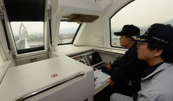 19일 오전 대구도시철도 3호선이 모노레일 전 구간에서 종합 시험운행을 하며 승차감과 정비 상태 등을 점검하고 있다.