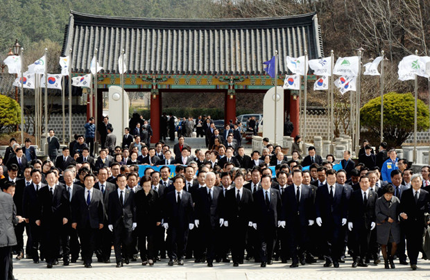 20일 오후 새정치민주연합 광주시당 창당대회에 참석하기 위해 광주를 방문한 민주당과 새정치연합의 김한길·안철수 공동창당준비위원장이 새정치연합 발기인 등과 함께 광주 북구 운정동 국립5·18민주묘지를 참배하기 위해 민주의문을 들어서고 있다.
