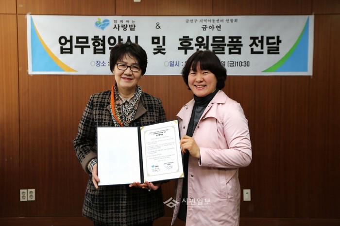 금천구 지역아동센터 연합회는 지난 21일 금천구청 소회의실에서 (사)함께하는 사랑밭과 함께 지역아동센터 활성화를 위한 업무협약을 맺었다. 사진은 협약체결 후 기념촬영 중인 금천구 지역아동센터 연합회 김미경 회장과 (사)함께하는 사랑밭 서형덕 회장(오른쪽부터).