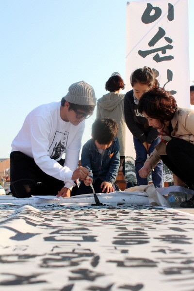 전남 여수시 중앙동 이순신광장에서 22일 대한민국 홍보동아리 생존경쟁이 관광객을 대상으로 '성웅 이순신'프로젝트의 일환인 난중일기 필사 행사를 진행하고 있다./사진=생존경쟁 제공