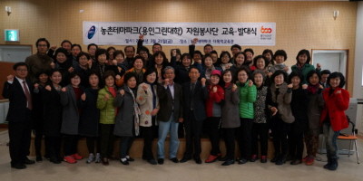 경기 용인시는 지난 21일 용인 농촌테마파크 다목적교육관에서 '농촌테마파크(용인그린대학) 자원봉사단' 발대식을 열고 문화해설 및 관람객 친절 응대요령 등의 내용으로 봉사자 교육을 실시했다. 사진은 이날 발대식에 참석한 자원봉사자들과 행사관계자들의 기념촬영 모습.