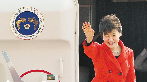 박근혜 대통령이 23일 오전 경기 성남 서울공항에서 전용기를 타고 제3차 핵안보정상회의가 열리는 네덜란드로 출발했다. 박 대통령은 네덜란드 헤이그에 도착한 뒤 24~25일 열리는 제3차 핵안보정상회의 및 마르크 루터 네덜란드 총리와 정상회담, 빌렘 알렌산더 네덜란드 국왕 주최 오ㆍ만찬 등의 일정에 참석한다. 박 대통령이 비행기에 탑승 직전 손을 흔들고 있다.