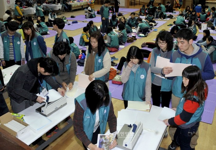 서울 서대문구는 지난 22일 구청 대강당에서 '4기 가족봉사단' 발대식을 열고 첫 봉사활동을 했다. 사진은 이날 발대식에 참석한 4기 가족봉사단이 어려운 이웃들에게 전해질 '이면지 재활용 노트'를 만들고 있는 모습.