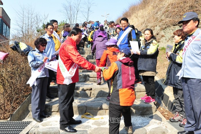 25일 경기 양주시가 양주소방서와 합동으로 불곡산 등산로 일대에서 산불예방 캠페인을 실시하고 산불발생시 행동 요령을 안내하는 홍보물을 배포하는 한편 쓰레기를 수거하는 환경정화활동도 펼쳤다. 사진은 등산객들에게 홍보물을 나눠주는 모습.