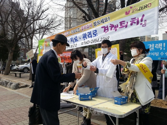 지난 24일 경기 광주시 보건소가 '제4회 결핵예방의 날'을 맞아 공무원·자원봉사자 등 50여명이 참여해 '철저한 발견·치료·관리로 결핵퇴치!, 결핵예방 365'라는 슬로건을 내걸고 결핵예방 캠페인과 홍보활동을 실시했다. 사진은 이날 참여자들이 시민들에게 관련 내용을 홍보 중인 모습.