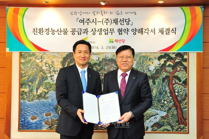 경기 여주시와 ㈜채선당은 25일 오전 11시 여주시청 시장실에서 친환경 농산물 공급 및 상생협력 양해각서 체결식을 열었다. 이날 협약에 따라 채선당은 여주 친환경농산물 사용을 확대하고 시는 친환경 농산물 공급과 시설확충을 위한 행정적인 지원을 할 계획이다. 사진은 김춘석 여주시장(오른쪽)과 김익수 채선당 대표(왼쪽)가 기념촬영을 하는 모습.