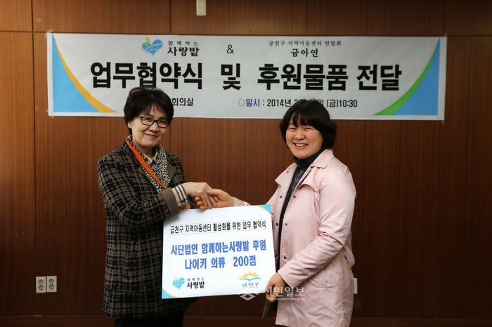 지난 21일 서울 금천구청 소회의실에서 지역아동센터 연합회가 센터의 활성화와 복지향상을 위해 '함께하는 사랑밭'과 상호협력하는 의미로 업무협약을 맺었다. 사진은 김미경 지역아동센터 연합회 회장(오른쪽)과 서형덕 '함께하는 사랑밭' 회장(왼쪽)이 기념촬영을 하고 있는 모습.