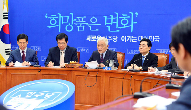 25일 오전 민주당 마지막 최고위원회의가 열린 서울 여의도 국회 당 대표실에서 김한길 대표가 모두발언을 하고 있다. 민주당은 오늘 공식 해산하고 26일 창당되는 새정치민주연합과 합당한다.