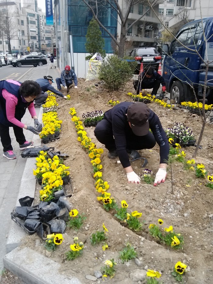 지난 25일 인천 남구 학익2동 통장자율회가 환경지킴이 노인들과 화단가꾸기 프로젝트 '자연은 사람이다'를 주제로 주민센터 도로 주변과 쓰레기 무단투기 취약지 주변에 화단을 조성했다. 사진은 학익동 306번지 주변에 팬지을 심고 있는 지역주민들의 모습.(사진= 인천남구 제공)