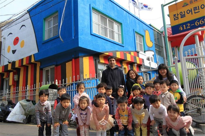 최근 서울 송파구 잠일어린이집 외벽이 외국 작가 'Sonni Adrian'의 재능기부로 인해 귀여운 그림과 눈에 띄는 색채작업으로 새단장을 했다. 사진은 벽화 및 색채작업을 마친 후 잠일어린이집 앞에서 어린이집 아동들과 기념촬영을 하고 있는 Sonni Adrian의 모습.(사진제공=송파구청)