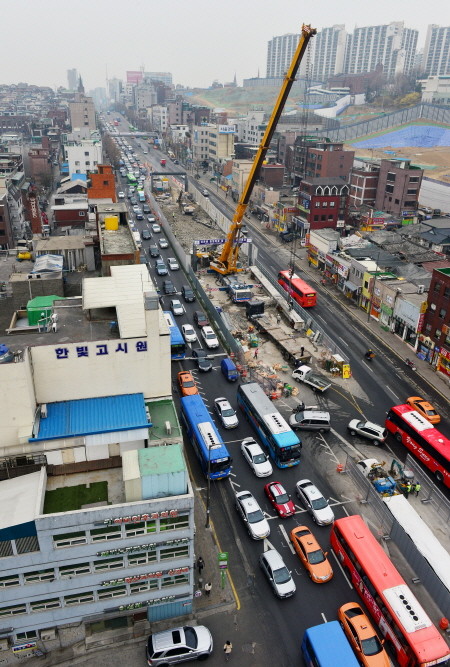 26일 오전 서울 마포구 아현동에서 지난 2월부터 순차적으로 철거에 들어갔던 아현고가도로의 마지막 교각이 인양된 가운데 인부들이 마무리 작업을 하고 있다. 서울시는 다음달부터 신촌로와 마포로를 잇는 2.2km의 중앙버스전용차로 설치 공사가 시작돼 오는 8월에 개통할 예정이라고 밝혔다.