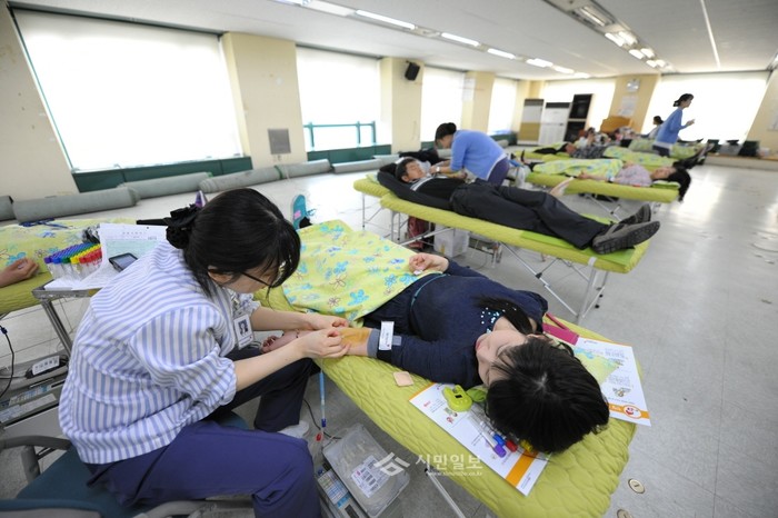 서울 중랑구는 각종 대형사고 및 질병으로 혈액 사용량은 크게 증가하는 반면, 저출산 고령화 및 말라리아 지역 헌혈제한 확대 등으로 헌혈자원이 감소할 것으로 예상돼 27일 오전 중랑구청 2층 대회의실에서 '사랑의 헌혈' 행사를 개최했다. 사진은 직원들이 헌혈을 하고 있는 모습. (사진제공=중랑구청)