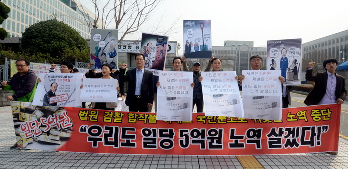 광주진보연대 회원들이 27일 오전 광주 동구 지산동 법원 정문 앞에서 '황제노역' 논란을 일으킨 대주그룹 허재호 전 회장(72)에 대해 일당 5억원 판결을 내린 법원을 규탄하고 있다.
