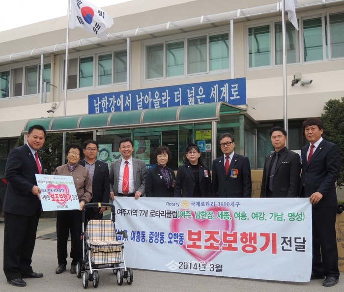 지난 25일 경기 여주시의 7개 로터리 클럽 회원들이 관절염 등으로 거동이 불편하고 경제적 상황이 어려운 지역내 노인들을 위해 천만원 상당의 성인용 보행기 50대를 구입해 지역내 읍·면·동 사무소에 전달했다. 사진은 이날 전달식에 참여한 로터리 클럽 회원들의 모습.