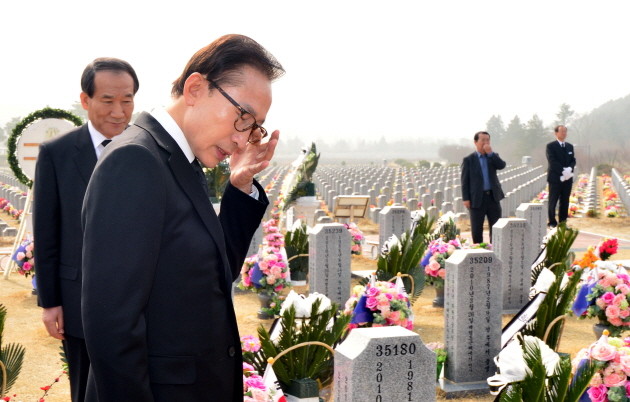 이명박 전 대통령이 27일 오전 대전 유성구 국립대전현충원을 방문, 참배뒤 천안함 용사 묘역을 둘러보던 중에 눈물을 닦고 있다