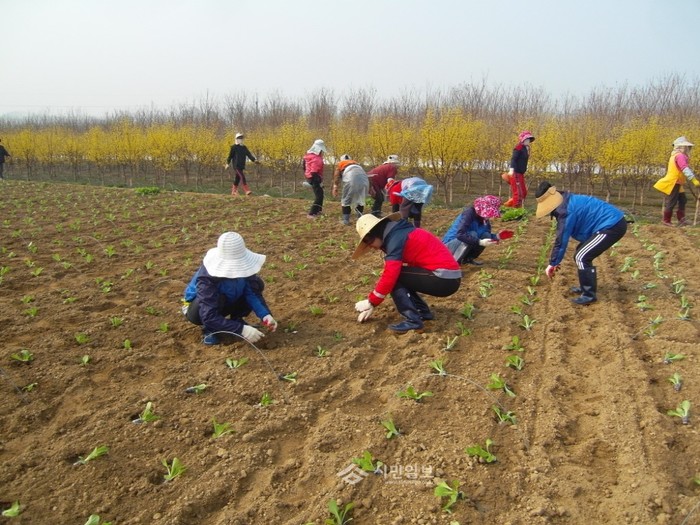 충남 아산시 배방읍은 지난 27일 11명의 직원들이 참여한 가운에 봄철 일손 부족으로 어려움을 겪고 있는 북수4리의 지역농가를 찾아가 약 4000㎡의 밭에 물을 대고 배추 모종 1만 2000여주를 심었다. 사진은 이날 일손 돕기에 참여한 배방읍 직원들의 모습.(사진제공=아산시청)
