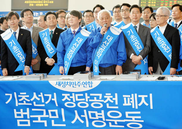 새정치민주연합 김한길ㆍ안철수 공동대표가 30일 오전 서울 용산구 한강대로 서울역 내에서 열린 기초선거 정당공천 폐지 범국민서명운동 캠페인에서 모두발언을 하고 있다.